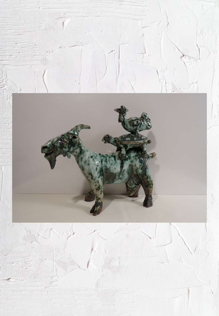 eine Schildkröte vor), Breite 28,5 cm, Höhe 26 cm. Die Künstlerin hat die Keramik-Fachschule Landshut absolviert, übt Lehrtätigkeiten aus (u.a. in Seattle und an dt. Gymnasien) und ist z.B. im Grassi Museum Leipzig
