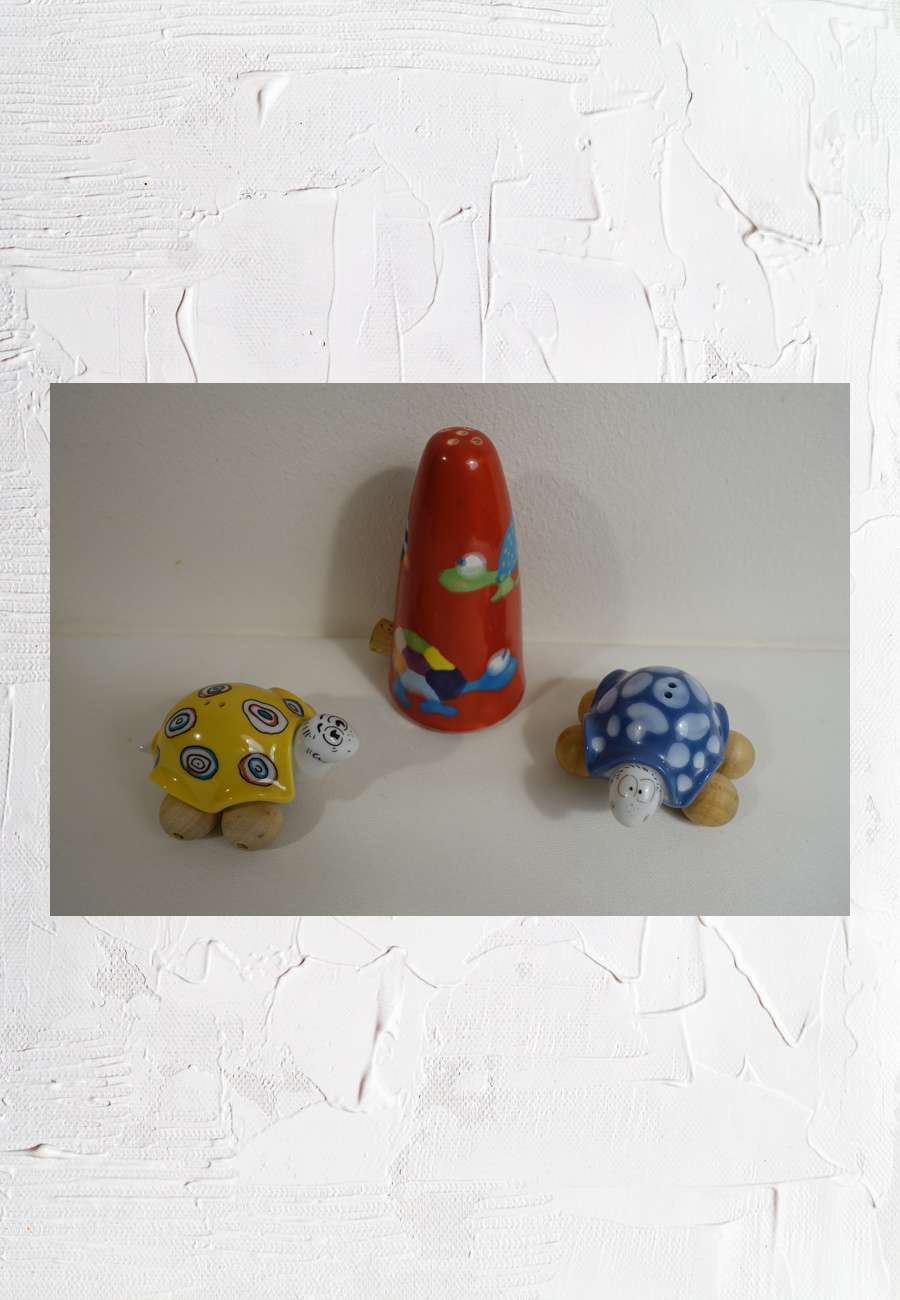 Salzstreuer, rechts und links auf Holzkugeln rollend, Goebel Porzellan GmbH, Größe 8,5 cm, s. auch zwei weitere Stücke der Firma. Der mittige Salzstreuer ist eine kleine Auftragsarbeit, handgetöpfert und farbenfroh mit 4 Schildkröten bemalt, sign., Höhe 12 cm, s. ebenfalls weitere Objekte von Frau Winterl.