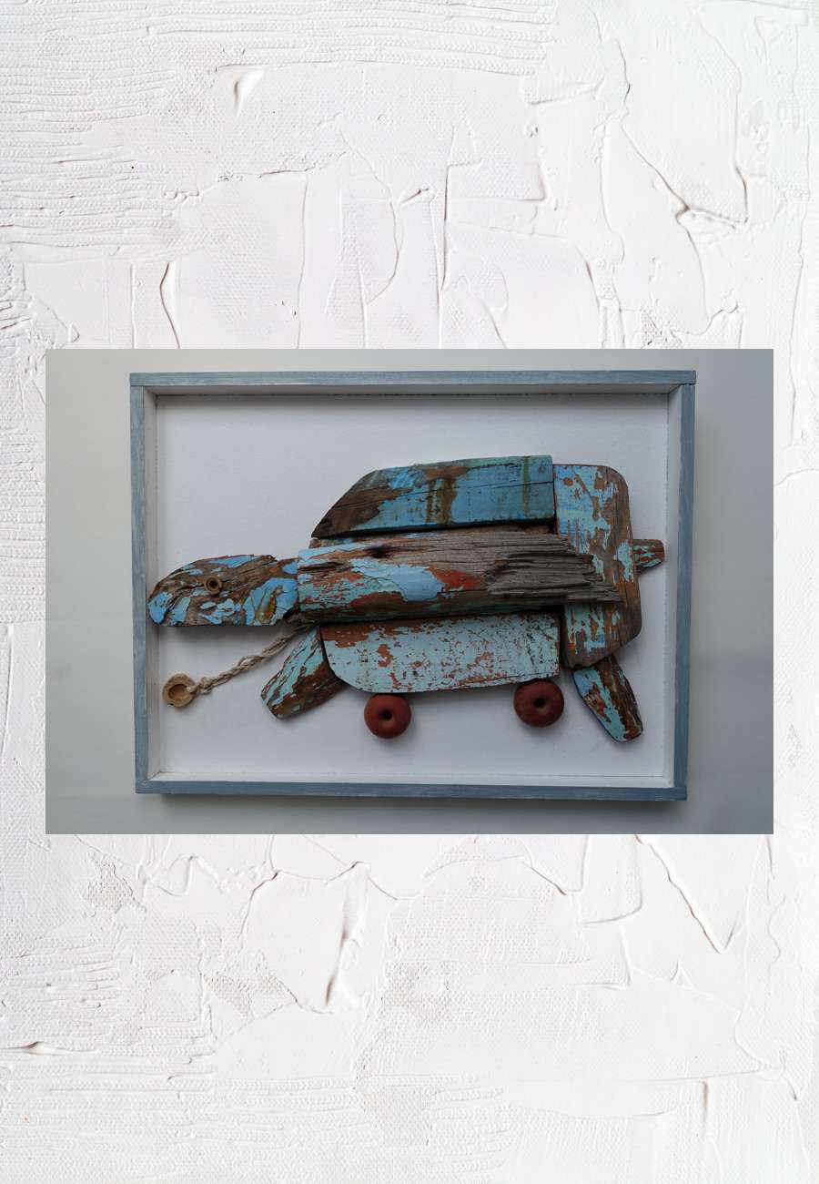 Collage aus Treibgut und Fundholz, in den Farben vollständig naturbelassen, Auftragsarbeit (man muß es nur erwarten können .... die Arbeit entstand erst durch ein Fundstück, das sich aus seiner Sicht als Kopf für eine Schildkröte eignete), Unikat, sign., Format 42 x 32 x 3 cm. Inspiration ist die Liebe zu den griechischen Inseln. Dies spiegelt sich in seinen Farbkompositionen. Der Autodidakt lebt in München, hält sich aber seit vielen Jahren regelmäßig auf der Insel Paros auf. Das Werk ist nach seinen Worten "wie ein Spielzeug konzipiert", seine Arbeiten zeichnen sich alle durch eine klare Handschrift aus. Den Titel "Luisa" hat er von einer alten Frau aus dem Dorf Lefkas abgeleitet. Mit dem Buch "Strandgut" hat Jan Zier dem