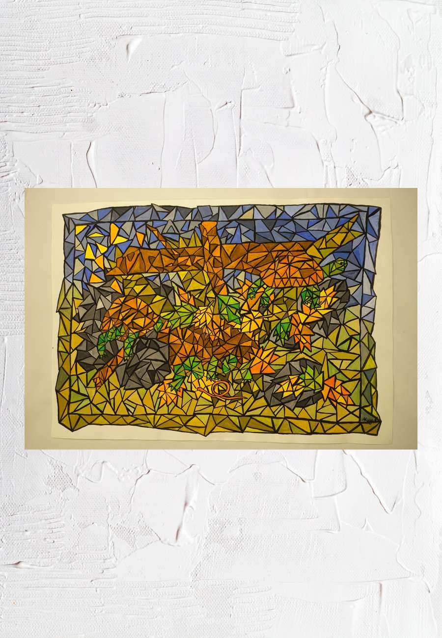 Tuschestift und Acrylfarben, sign., Format 60 x 42 cm. In diesem Suchbild verstecken sich drei gut getarnte Schildkröten. Die Formgebung erinnert auch
