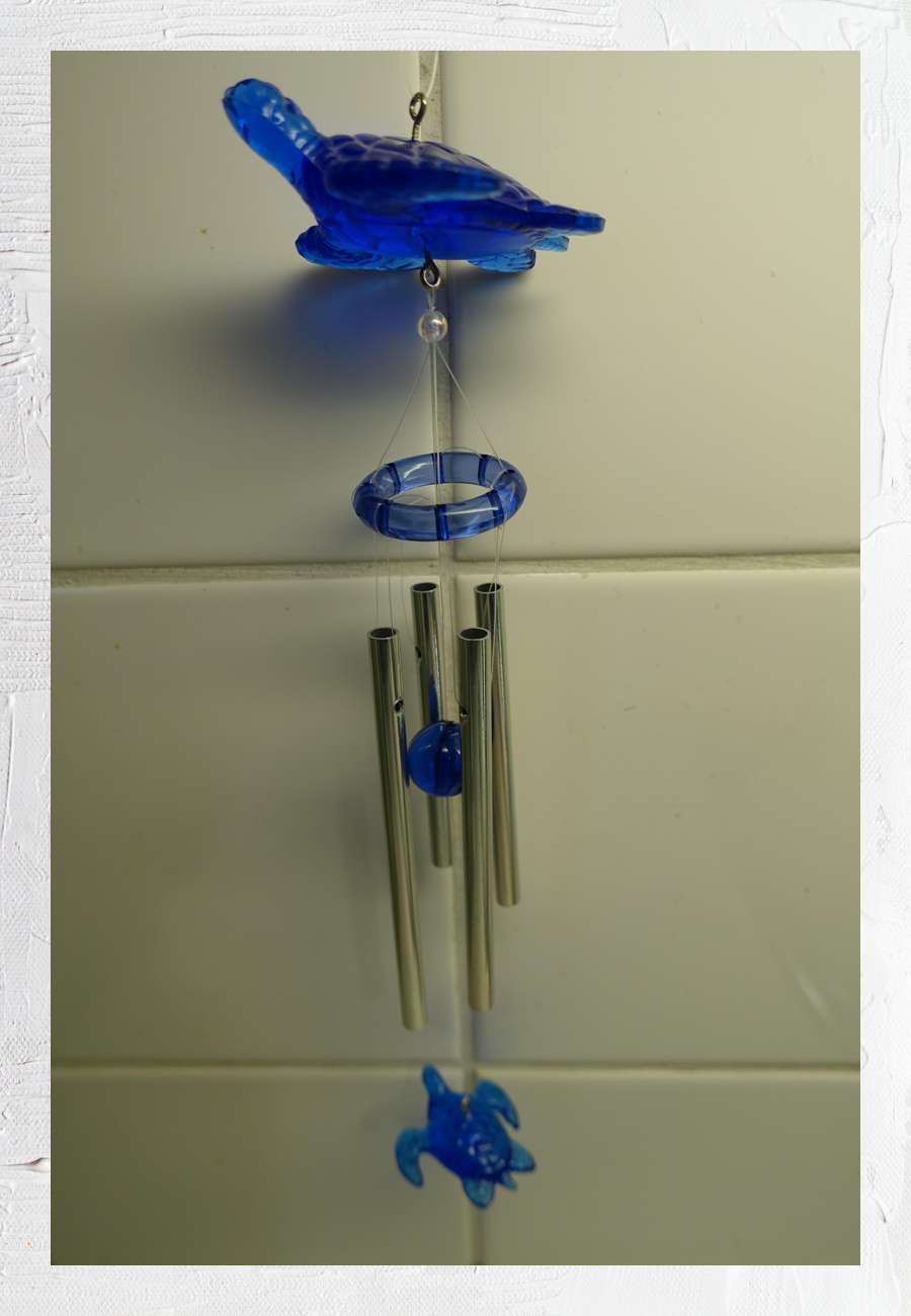 Mobile mit Klangstäbchen und kleinen Glasobjekten, Höhe ca. 30 cm.