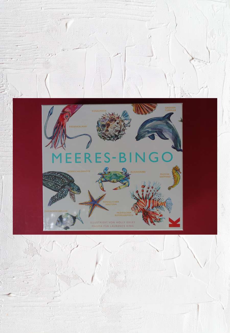Meeres-Bingo (für 6 Personen, ab 6 Jahren), mit Spielbrett und 64 Tierkarten aus Karton, sowie einem Heft mit Spielregeln und einer kleinen Beschreibung zu allen Tieren, gut illustriert. Ein Spiel darf m.E. alles sein, nur nicht langweilig. Es wird viel Wissenswertes über Meerestiere vermittelt, Laurence King Verlag, Berlin, Made in China 2021. Als Beispiel lautet der Text zur Lederschildkröte: "Die größte Meeresschildkröte mit einem Gewicht von bis zu 700 Kilo. Sie hat einen ledrigen, mit Längskielen versehenen Panzer statt eines Rückenschilds mit Hornschuppen. Sie kann über 1.000 Meter tief tauchen. Ihre Gattung hat sich in den vergangenen 100 Millionen Jahren kaum verändert."