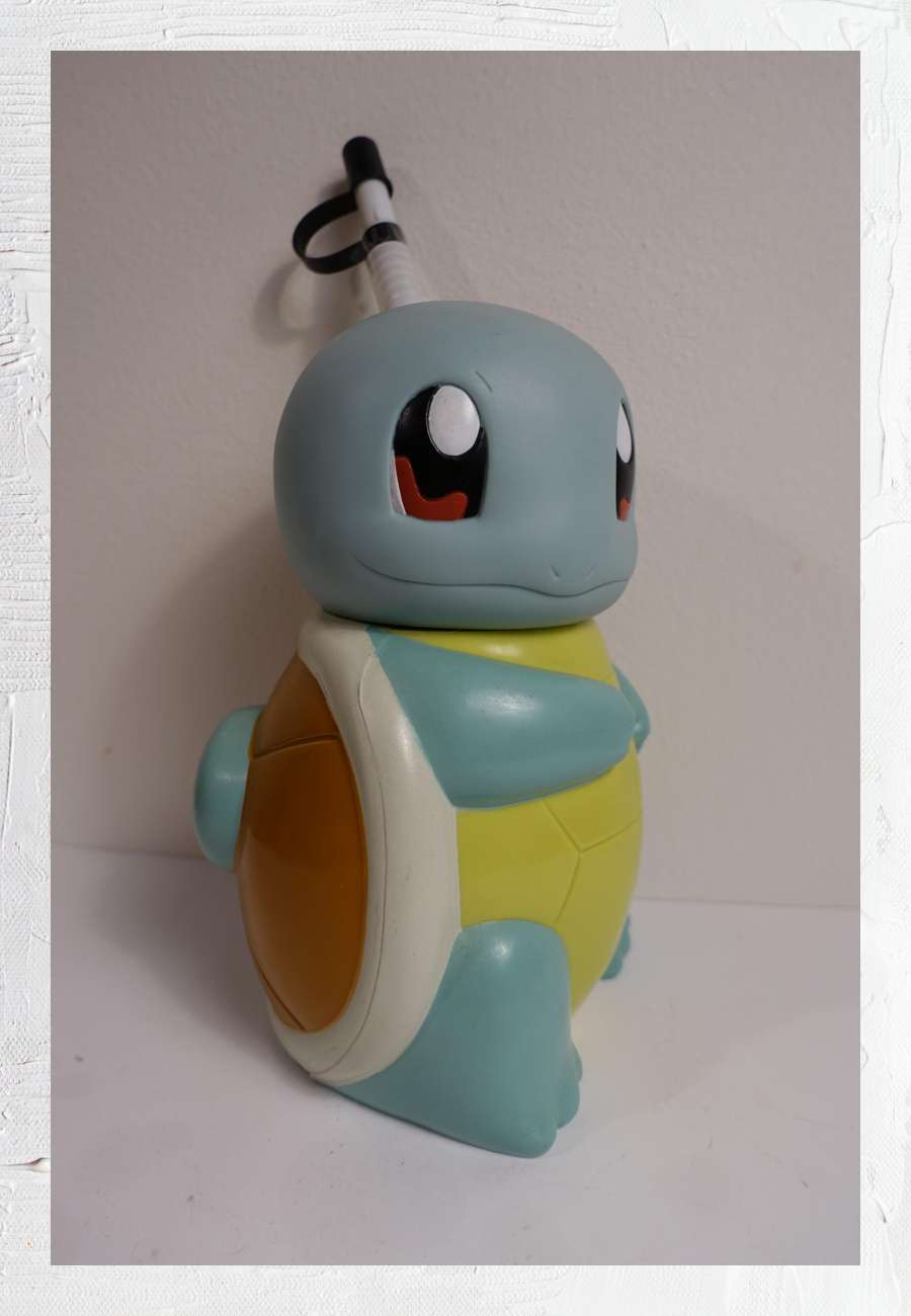 Pokémon-Figur "Schiggy" (abgeleitet von Schildkröte, im englischen "Squirtel", und von Turtle), hier als Trinkgefäß, Merchandising-Produkt von Nintendo, Höhe 18 cm, Made in China. In verwandtem Design gibt es auch eine Brotzeitdose.
