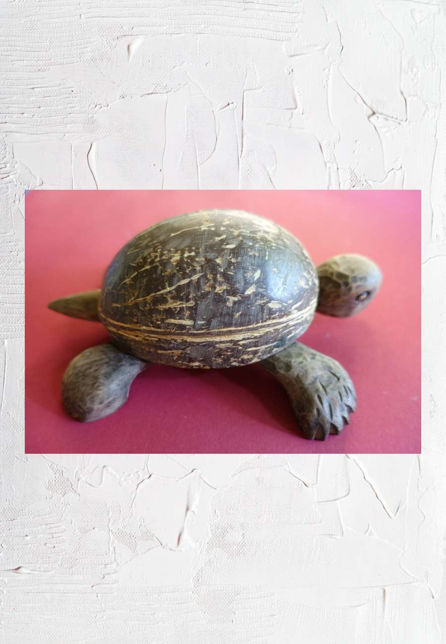 Kokosnuß (aus Indonesien) mit kleinen Einkerbungen, Gliedmaßen aus Holz geschnitzt, Kopf und Schwanz sind beweglich eingehängt, gefunden auf Tollwood, Größe 21 cm. Es ist inzwischen das sechste Objekt aus diesem Material.