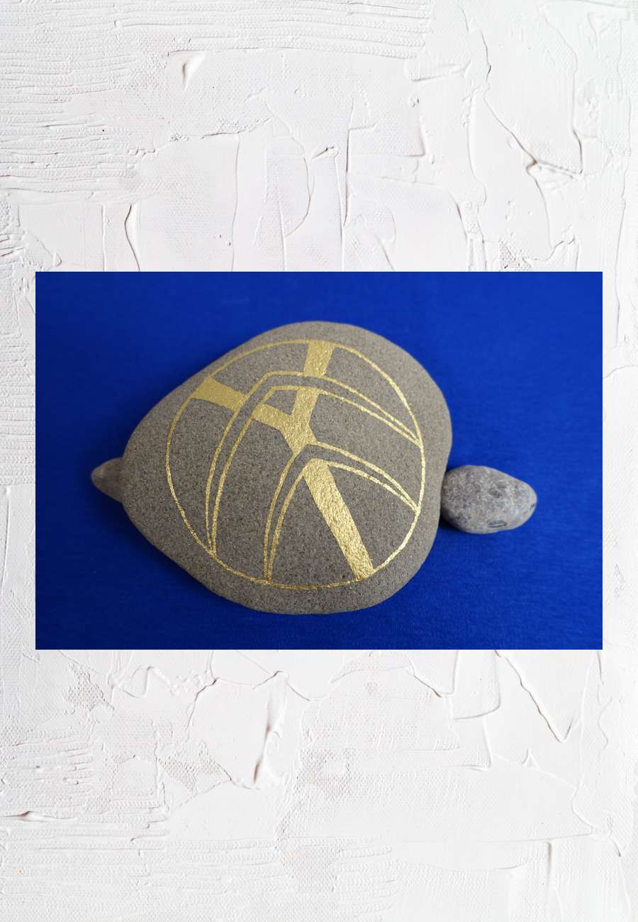 Isarkiesel, handbemalt (24 Karat Blattgold) mit einem schamanischen Schild (Unikat). "Symbole sind die Sprache der Seele". Dieses Symbol soll helfen, die Lebensaufgabe zu erkennen und so vielleicht eine