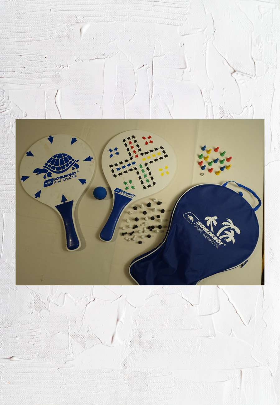 Vielseitiges Spiel mit 2 Ping-Pong-Schlägern (Holz), die zugleich als Spielbrett für "Mensch ärgere dich nicht" und Schach dienen, dazugehörig Ball, Würfel und