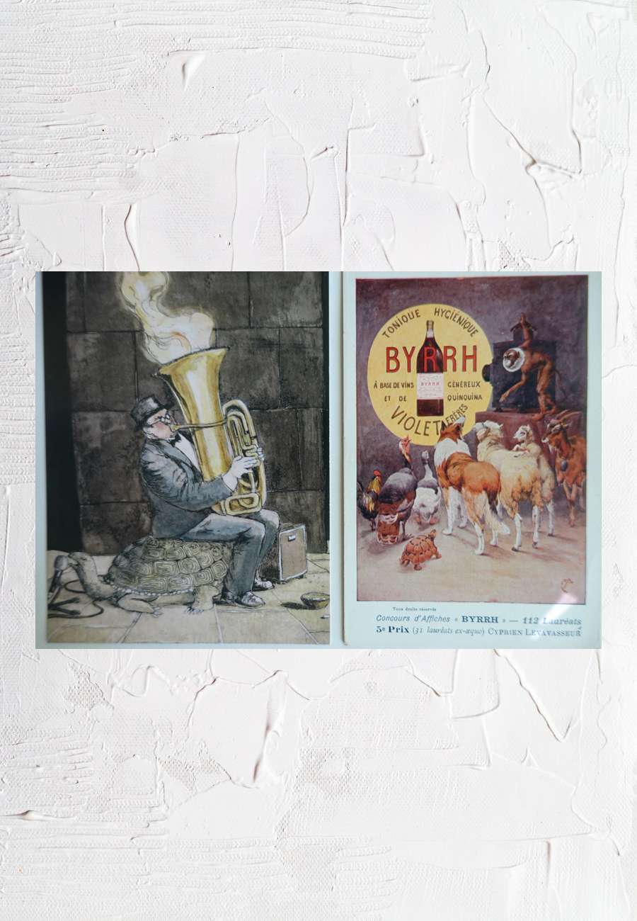 Links: Motiv "Kröte und Tröte" von Friederike Steil, rechts: alte französische Karte, Plakatwettbewerb für ein Tonikum auf Weinbasis und purpurroter