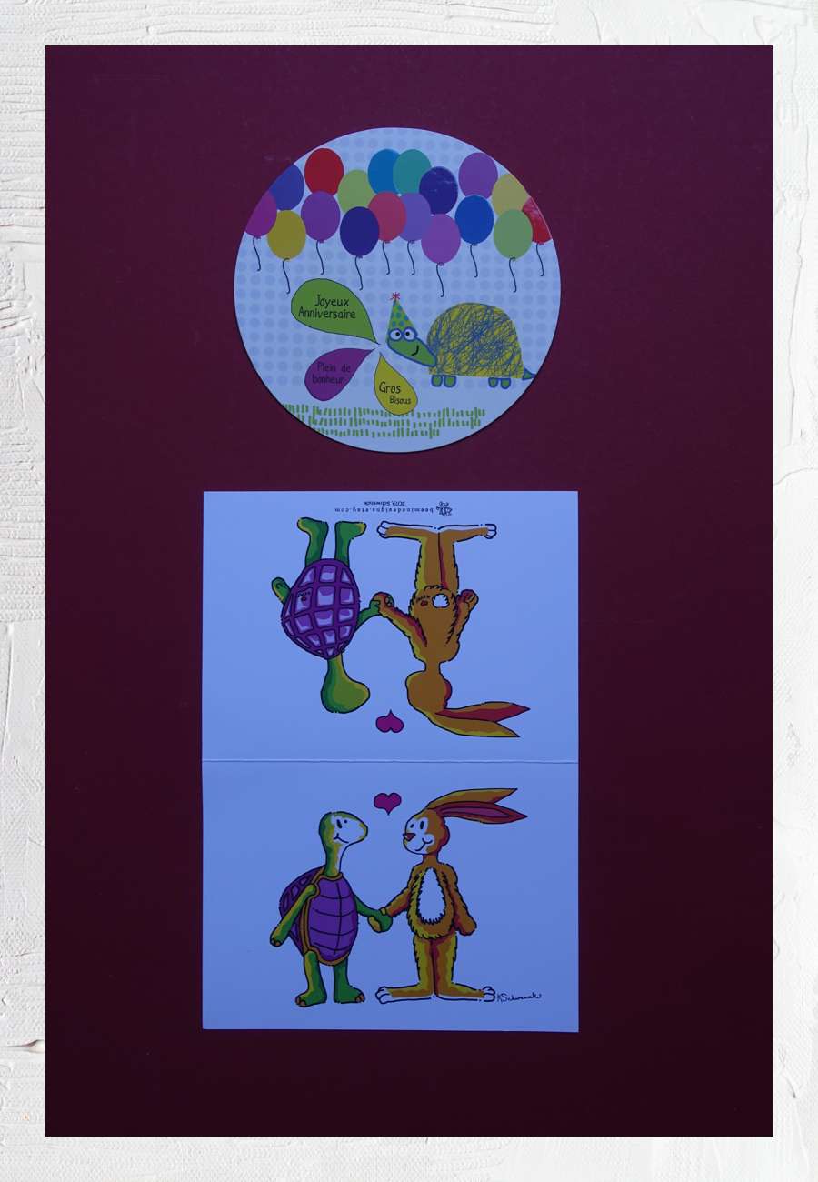 Eine Karte kann auch mal rund sein, Text sinngemäß: Alles Gute zum Geburtstag, Freude und viel Liebe, gestaltet von Clèmence G., Frankreich, Durchmesser ca. 14 cm, Doppelkarte unten: Love 4 ever, Designerin Kris Schwenck, New York.