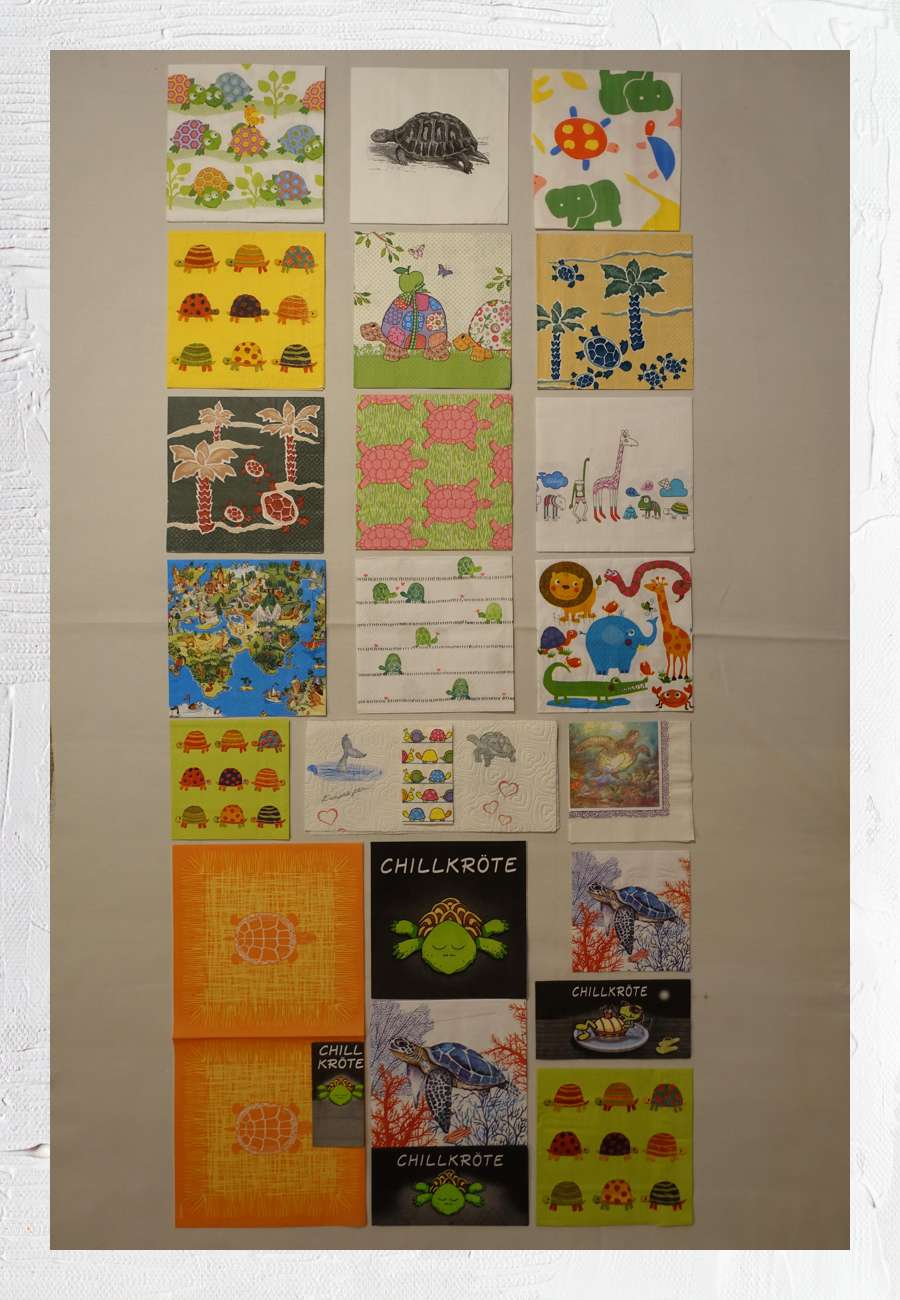 Servietten aus diversen Ländern, die Motive gibt es mehrfach und in unterschiedlichen Größen, auch auf Taschentüchern, Küchenrollen und WC-Papier.