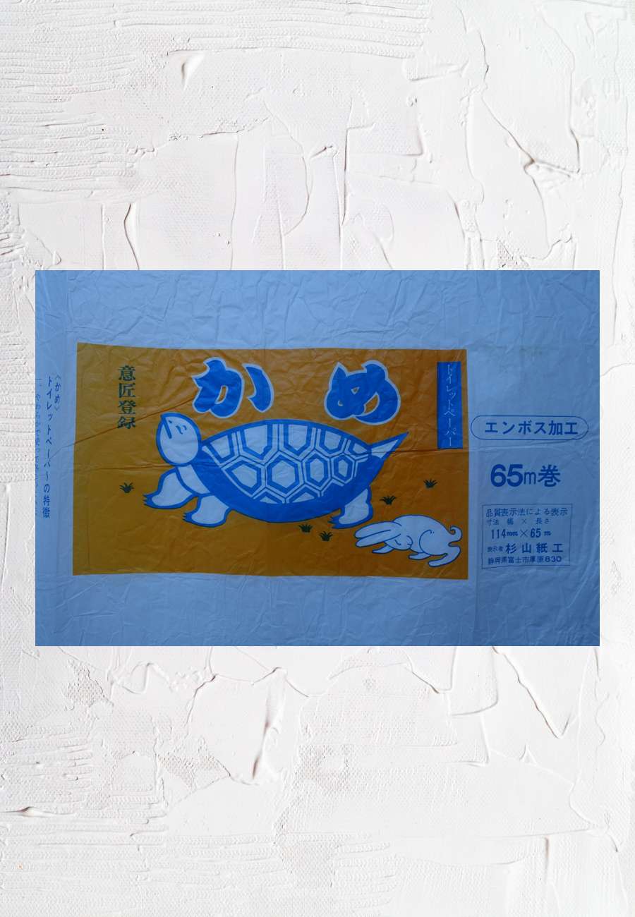 Verpackung von WC-Papier, mit Anspielung auf die international populäre Fabel des Wettlaufs von Hase und Schildkröte. Dabei veranschaulichen Haltung und Größe, wer gewinnt.