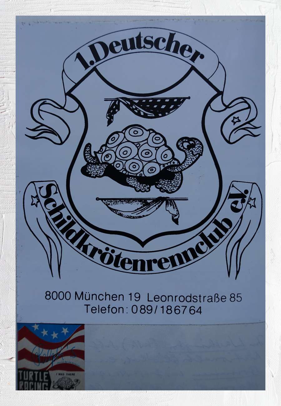 Aufkleber des Schildkrötenrennclub e.V. (bei "Ralph`s"), dort konnte man auf Schildkröten wetten. Club und Lokal gibt es aber nicht mehr.