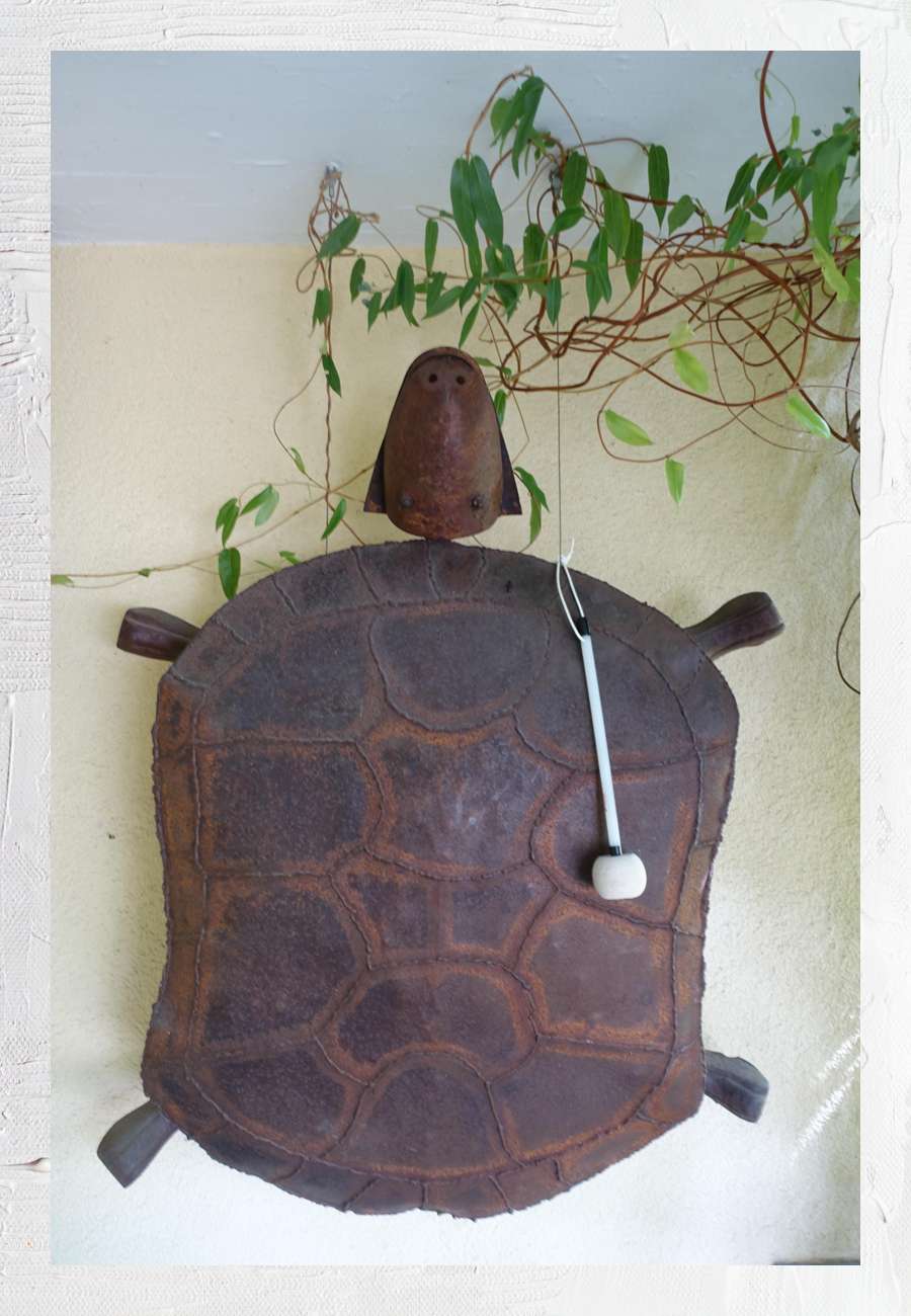Diese von dem professionellen Bildhauer entworfene, aus Fundstücken zusammengeschweißte Schildkröte hängt frei und eignet sich auch wunderbar als wohlklingender Gong, je nach zartem bis kräftigen Anschlag und je nach Anschlagspunkt. Höhe 90 cm, Tiefe 20 cm.