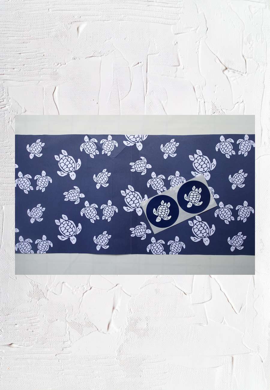 Innenseite der Tragetasche "Turtle friendly bag", 100 % recyclable (Karton) sowie 2 Werbeaufkleber der Firma Vilebrequin.