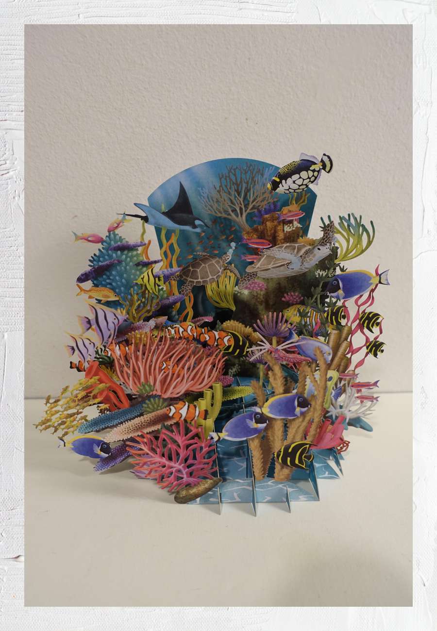 Greetings Card, 3-D-Pop up, "Reef Life, beautiful illustration", Laser cutting, Great Britain, Made in China. Das dreidimensionale Motiv beinhaltet auf sieben Ebenen u.a. Schildkröten, Fische und Korallen. Am Great Barrier Reef befinden sich weltweit die größten Nistplätze für Meeresschildkröten.