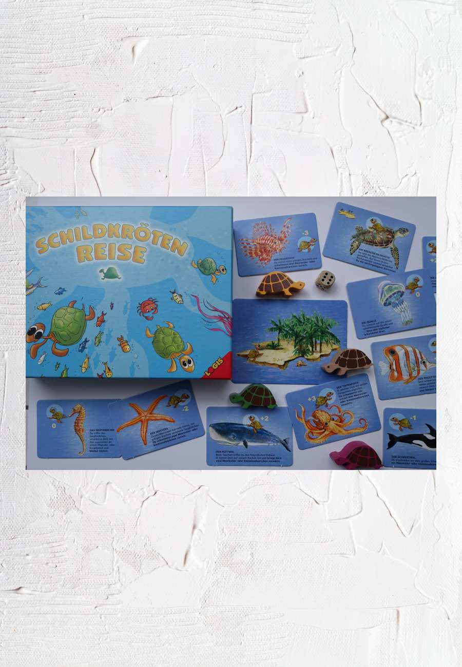 Spiel "Schildkrötenreise", ab 6 Jahre, u.a. mit 31 Meerestier-Kärtchen und 4 Holzschildkröten, Vertriebsges. California Products. Ziel ist es, als erster auf der Insel anzukommen.