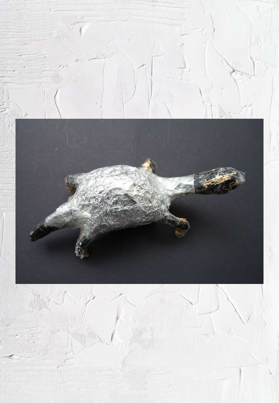 Selbst geformt, aus Draht, Alufolie, Schokoladenpapier und Tesafilm, Größe ca. 20 cm.