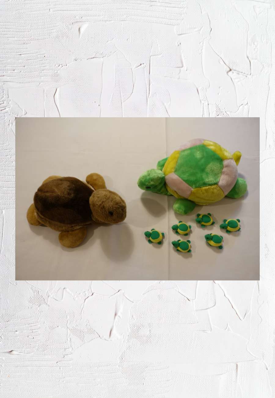Plüschtiere, links "Hilde", Firma Plüti (Sonneberg) und rechts mit Reißverschluß am Bauch, aus dem dann sechs Krötchen kommen, Firma Deichmann (Essen),