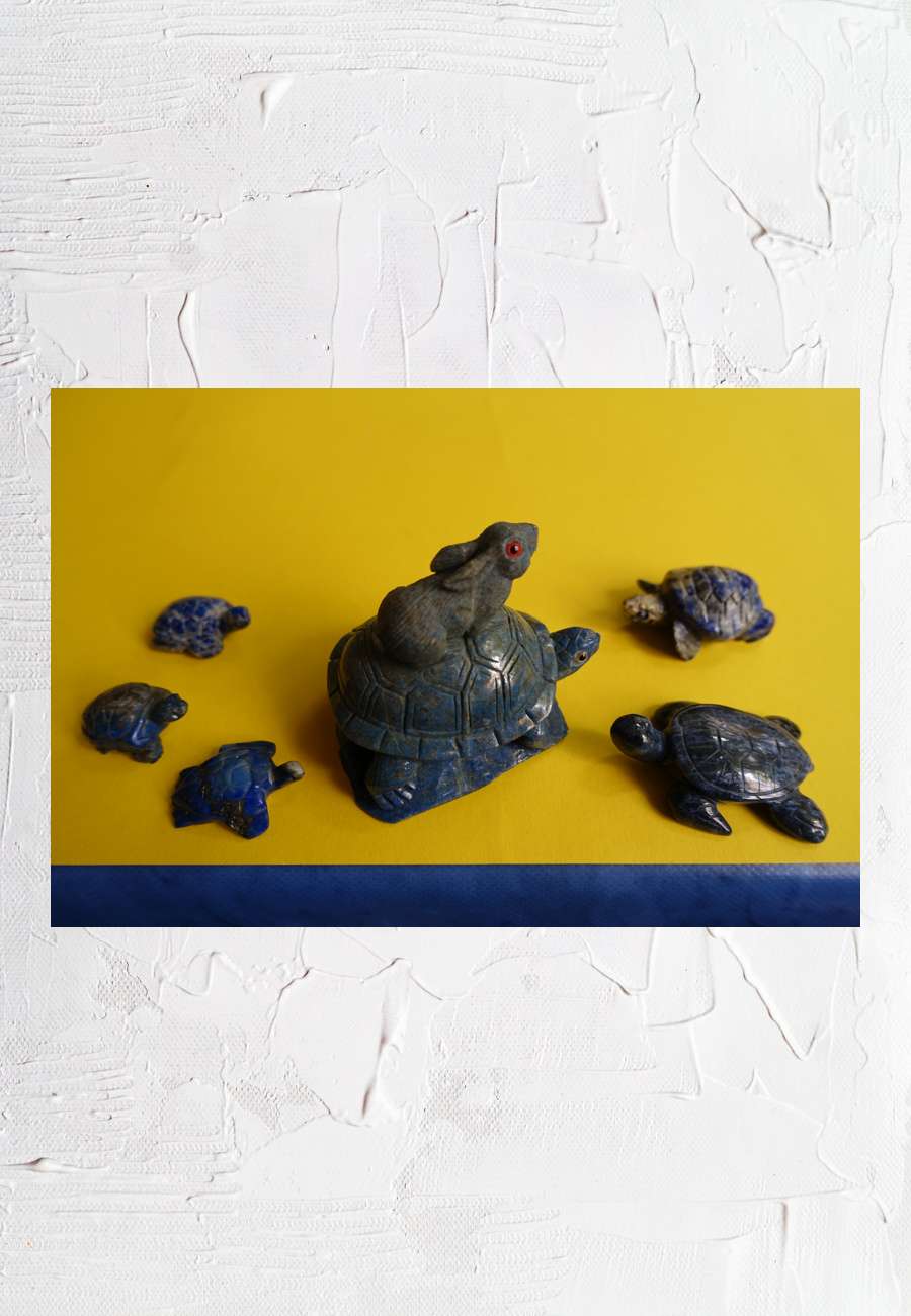 Alle Objekte sind aus Lapislazuli, meist erworben auf der Mineralienmesse in München. Ausgefallen ist das Motiv des Hasen auf einer Schildkröte, Größe ca.