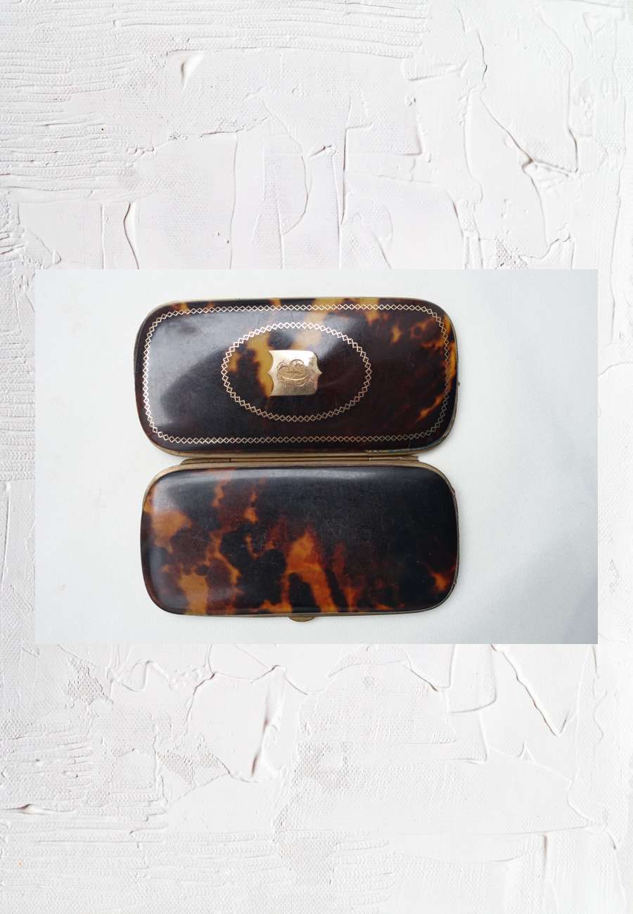 Kunsthandwerkliches Brillenetui aus Schildpatt der Echten Karettschildkröte, Messingfassung, beidseitig mit einer Dehnfalte, innen 2 Fächer, mit blauer Seide ausgeschlagen. Auf der Oberseite ein Wappen