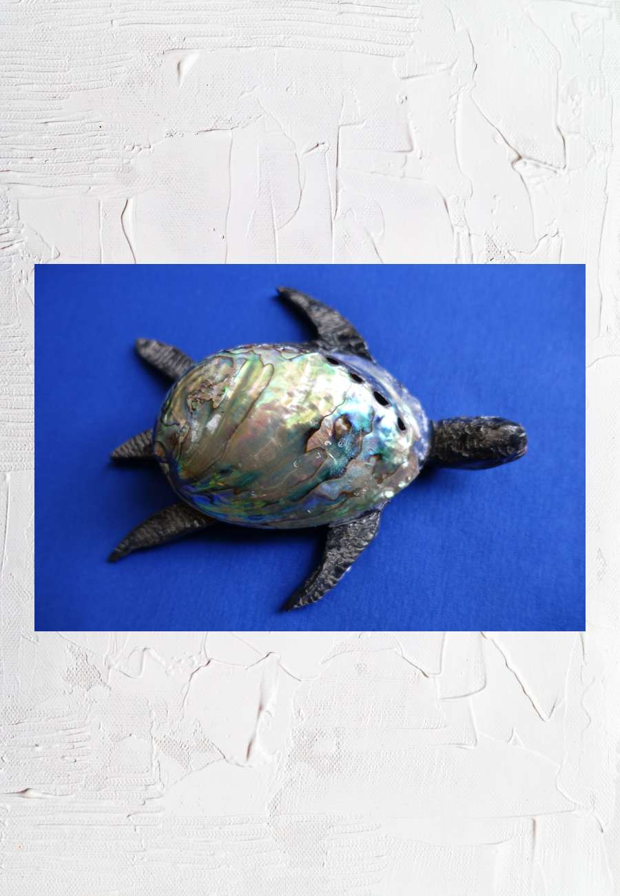 Eigene Töpferarbeit, sign. , Größe 19 cm. Als Panzer dient eine essbare Meeresschnecke (Haliotis-Iris, Größe 11,5 cm), die auch als Seeohr oder Abalone bezeichnet wird, aus Neuseeland, beidseitig mit prächtigem Perlmuttglanz. Durch die kleinen Öffnungen am oberen Rand können Meerwasser und Abfallprodukte entsorgt werden. Es gibt noch zwei weitere, ziemlich ungewöhnliche und sehr unterschiedliche Meeresschnecken, die sich als Schildkrötenpanzer eignen (ebenfalls aus Neuseeland).