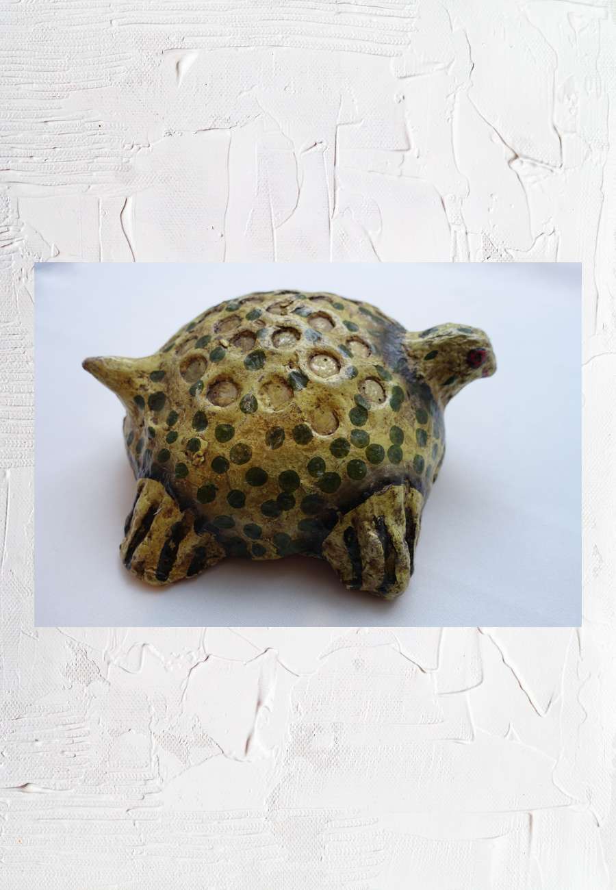 Schildkröte aus Pappmaché, mit kreisförmigen Vertiefungen, handbemalt, Länge 20 cm.