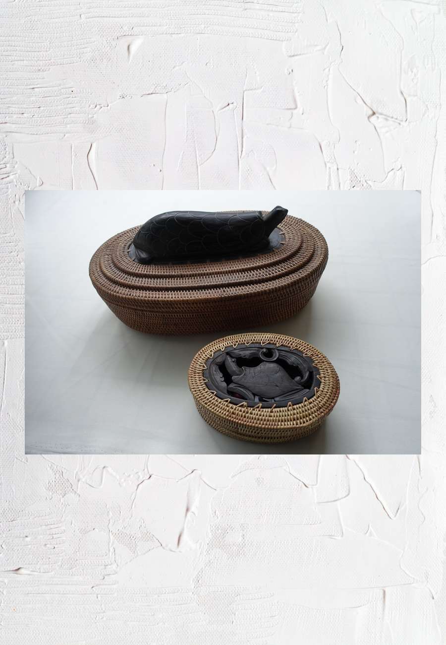 Körbe, fein geflochten, die in den Deckel integrierte Schildkröte ist jeweils aus Ebenholz (oben massiv, unten kunstvoll durchbrochen), Größe 32 bzw. 15 cm.