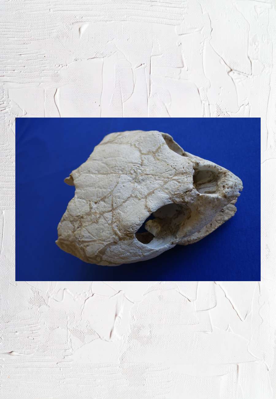 Versteinerter Kopf einer stattlichen Meeresschildkröte mit großen Augenhöhlen und aufgerissenem Maul, ca. 21 cm lang, 19 cm breit und 10 cm hoch. Die Präparation erfolgte in Qued-Zem.