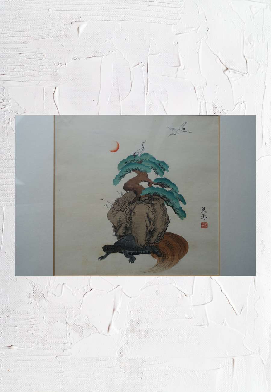 einen großen Felsen mit Kiefer, darüber die Sonne und ein Kranichpaar, die typischen Symbole für Glück und langes Leben. Mit Kaiser Meiji begann die