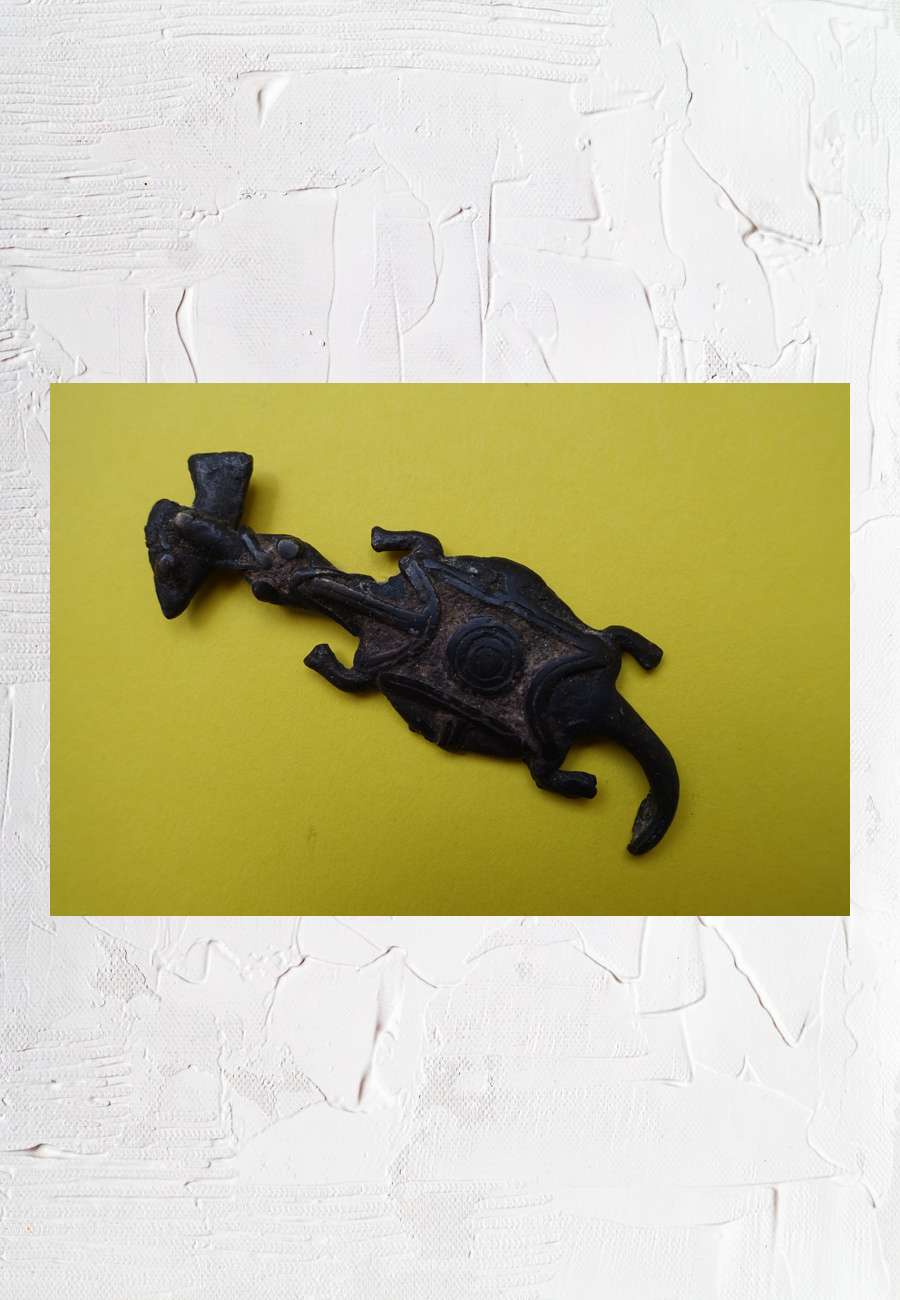 Ein ungewöhnlich gestaltetes Motiv: die Landschildkröte schnappt sich einen Fisch. Der Bronzeguß stammt aus dem einstigen Obervolta, jetzt Burkina Faso, ein Land mit einer großen ethnischen