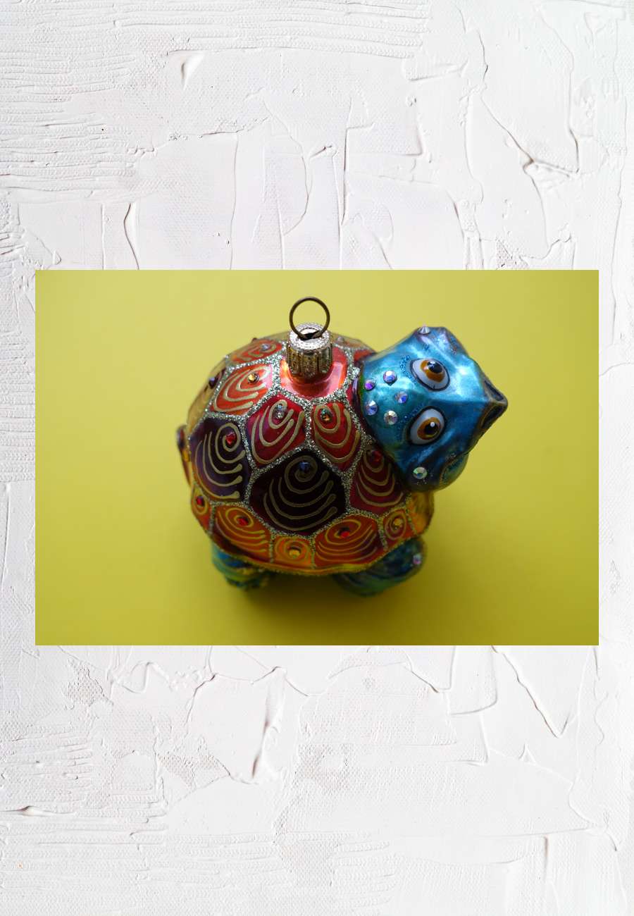 Christbaum-Kugel, Swarovski Kristallwelt, Wattens (Tirol), handbemalt, kleine Glassteinchen aufgeklebt, Größe ca. 9,3 cm. Dort hat sich eine Reihe von Künstlern engagiert, so auch André Heller (siehe u.a. Wunderkammer zum Thema Frieden).
