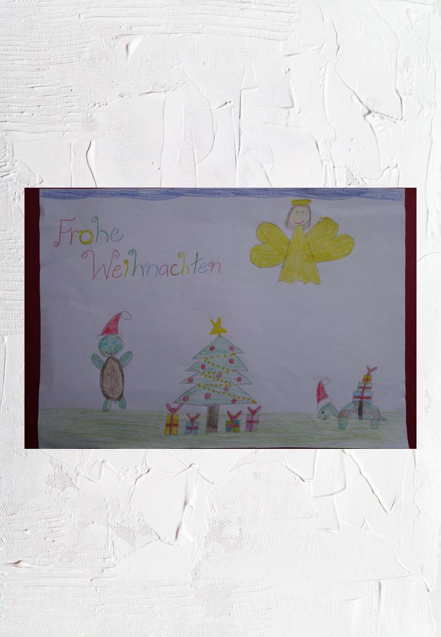 Ein fröhliches Weihnachtsbild, Zeichnung, Bleistift und Farbstifte, mit rückseitiger Widmung, Format DIN A 4, Alter 10 Jahre.