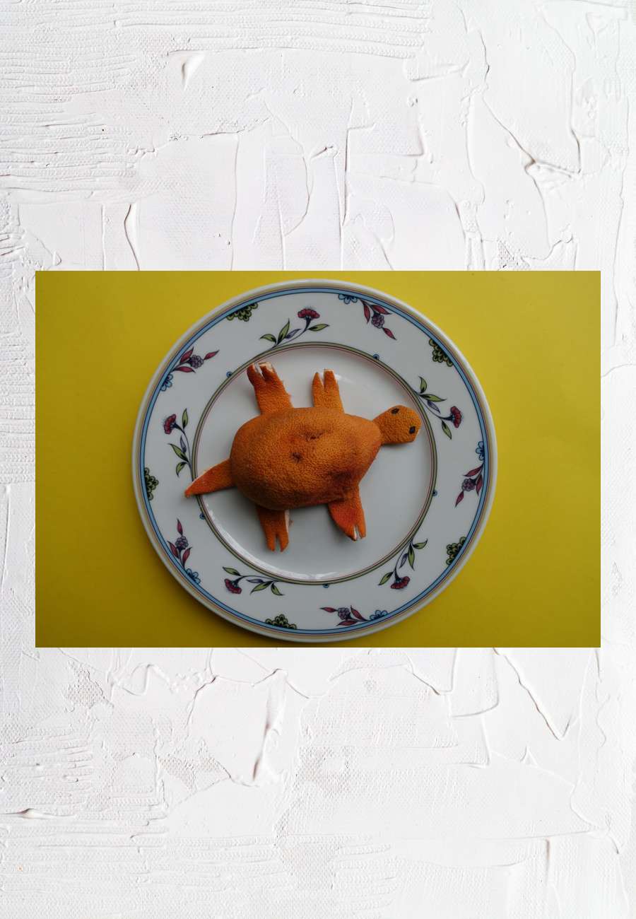 Vergängliche Collage, zusammengesetzt aus der Schale einer Grapefruit, Größe ca. 14 cm. Die Zitrusfrucht wird in vielen subtropischen Ländern angebaut und ist eine Kreuzung aus Orange und Pampelmuse.