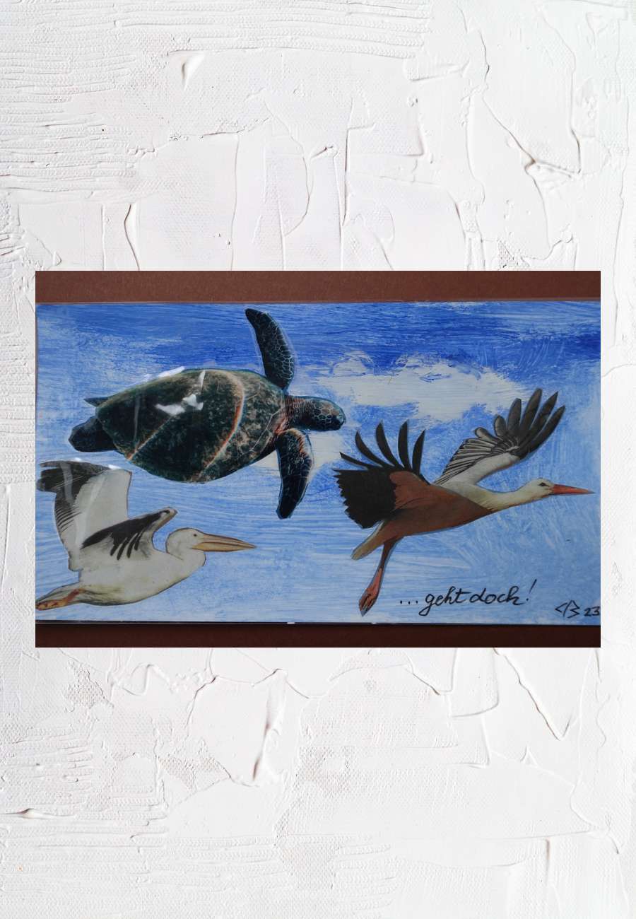 Können Schildkröten fliegen? Kreative Collage mit Aquarell und Deckweiß, geschützt mit einer Plastikfolie, Format 22 x 12 cm, sign.