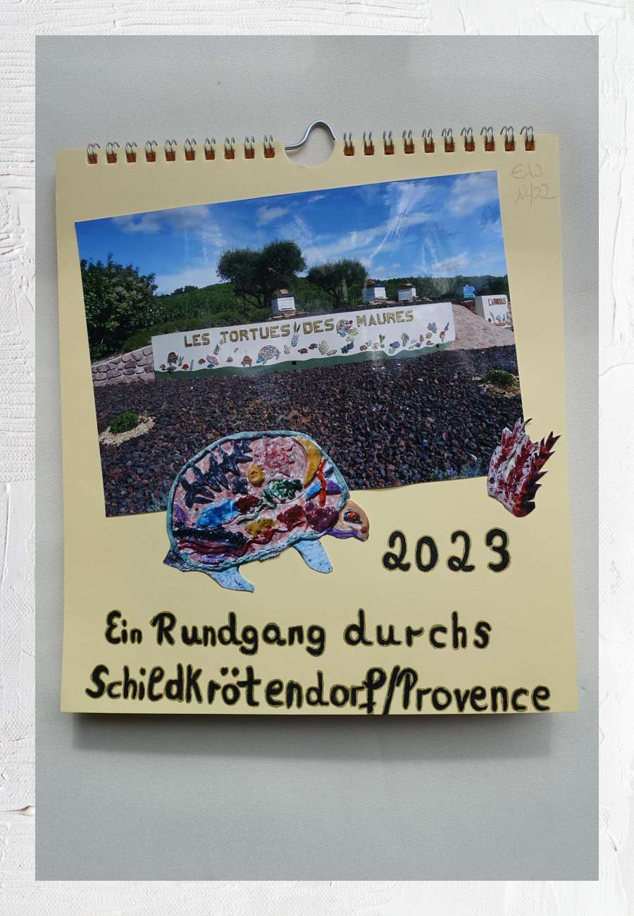 Fotokalender mit individueller Titel-Collage und 12 Fotos (Format 18 x 12,6 cm) zum Schildkrötendorf Les Tortues Des Maures. Neben diversen Arten sind auch Kunstobjekte aus dem dortigen Museum zu sehen.