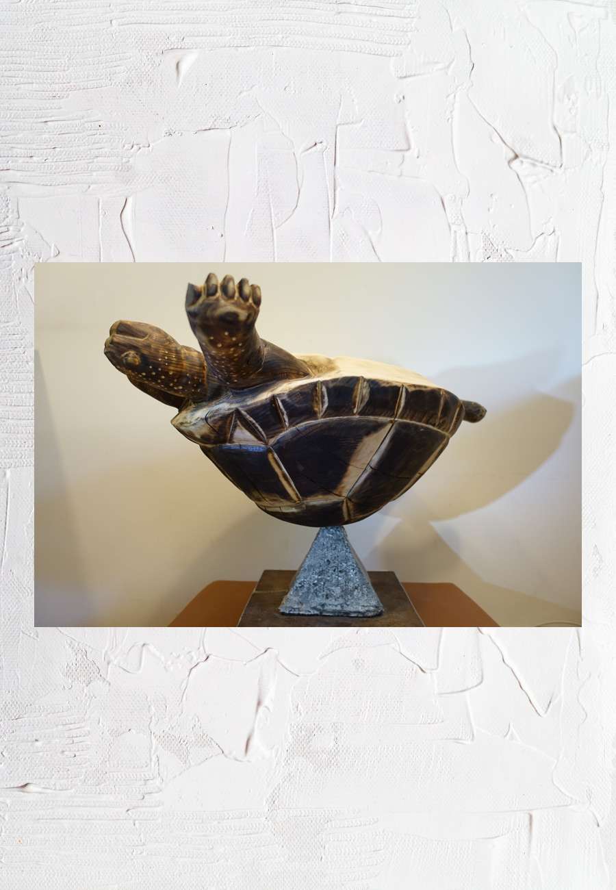 Freie Bildhauerarbeit, Lindenholz, mittels Bunsenbrenner geflämmt und dann teilweise wieder abgeschliffen, pyramidenförmiger Sockel aus eingeschmolzenem Altmetall, Titel: "Testudo mobile" (abgeleitet von Perpetuum mobile, weil sich die Schildkröte endlos drehen läßt), sign., Länge 62 cm, Höhe 37 cm. Das Objekt war auf der Internationalen Handwerksmesse München ausgestellt und hat mich sofort beeindruckt. Der junge Künstler (mit solider handwerklicher Ausbildung) ist Absolvent der Berufsfachschule für Holzschnitzerei Berchtesgaden und strebt die Fortbildung zum Meister in Empfertshausen/Thüringen an.