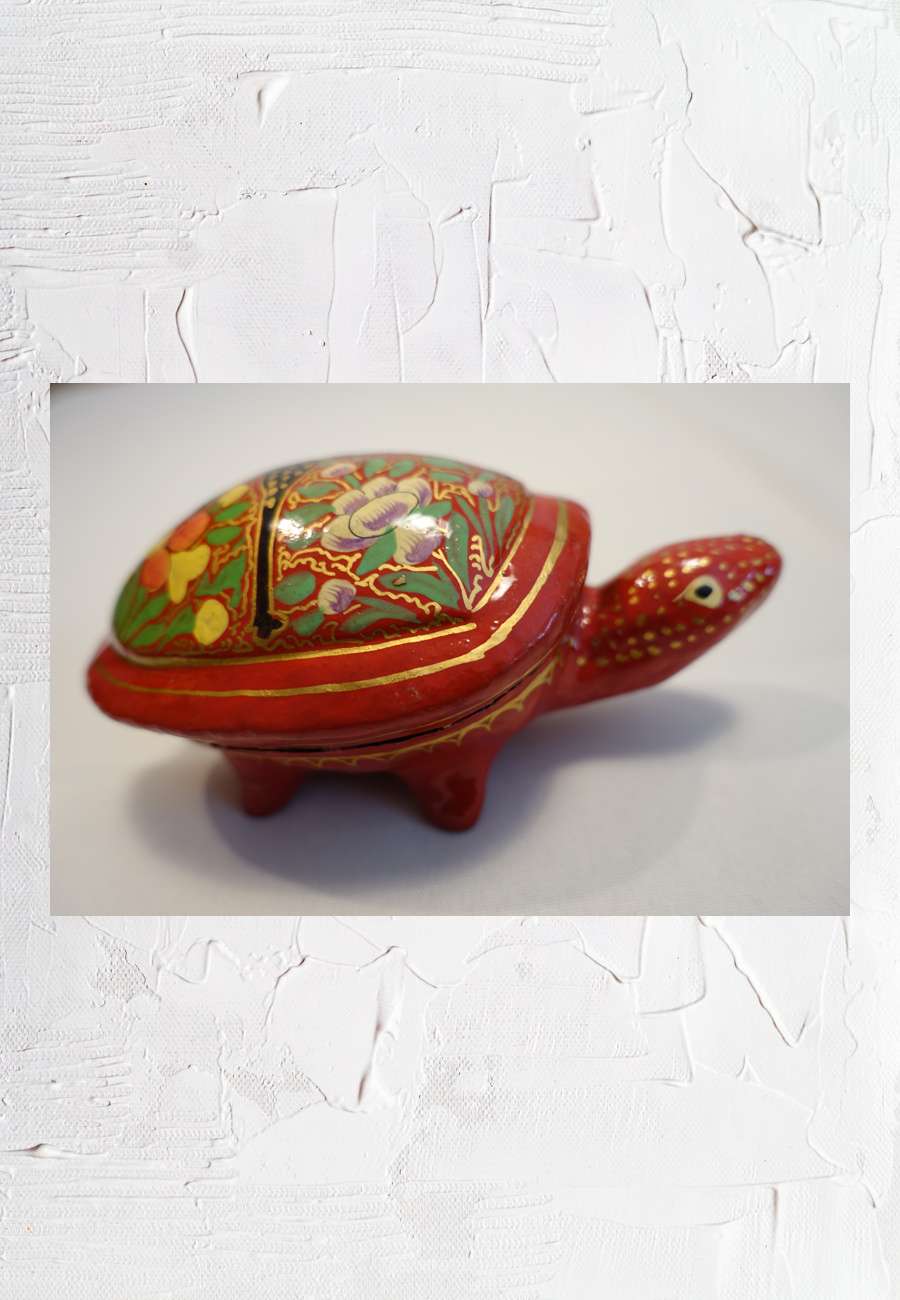 Lack-Dose aus Pappmaché, handbemalt (in der aus Kaschmir mehrfach vertretenen Technik), hier jedoch aus Pushkar (im nordindischen Bundesstaat Rajasthan), Größe ca. 15 cm.