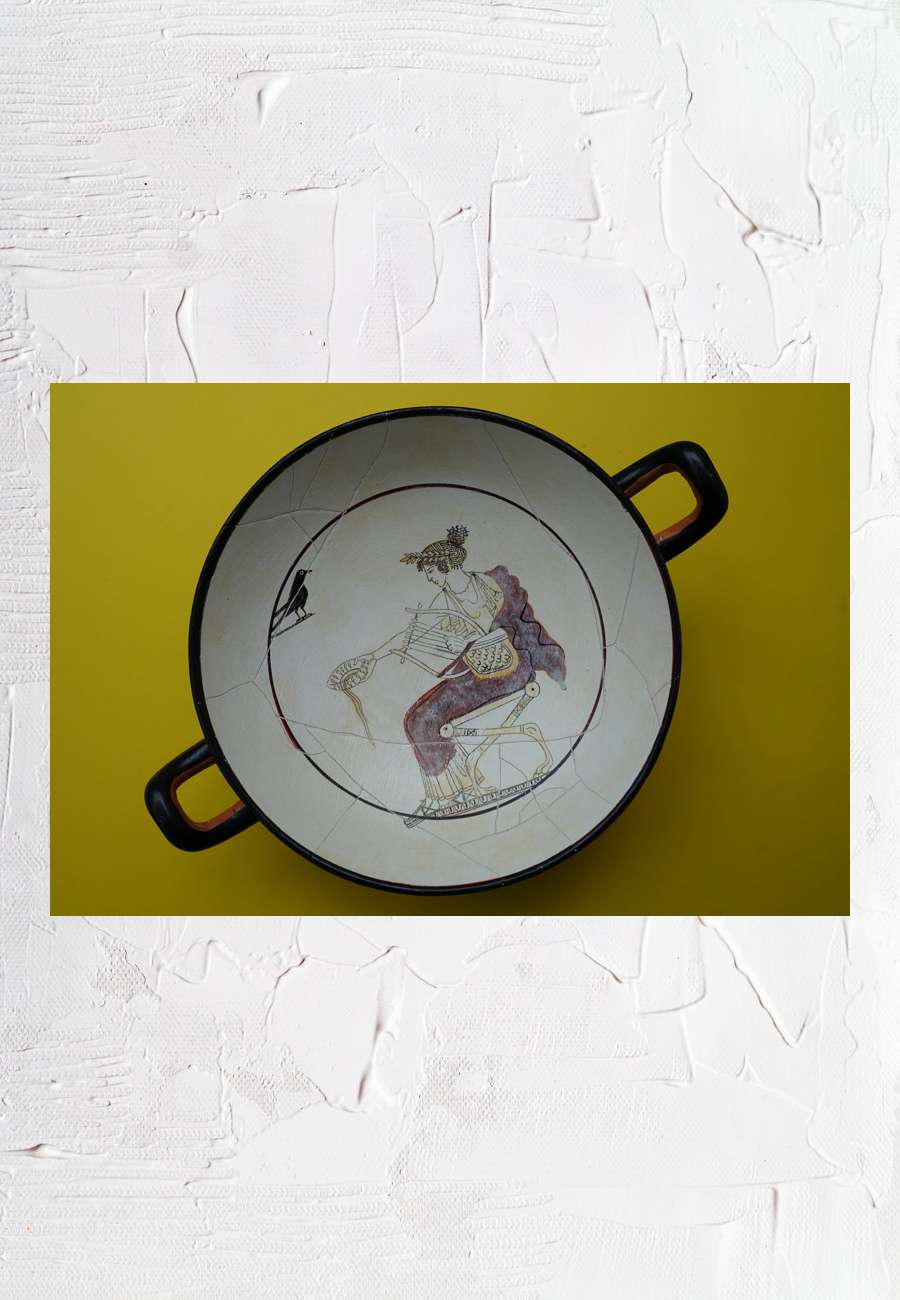 Flaches Trinkgefäß (Kylix), Replik des Originals aus dem Archäologischen Museum in Delphi, Durchmesser 23,8 cm, Höhe 8,4 cm. Der Name des Malers ist nicht überliefert, das Motiv dennoch berühmt: