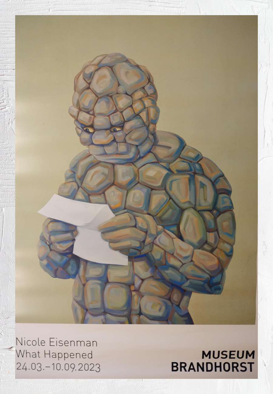 Plakat zu dem großen Gemälde, Titel: "Vom Erfolg zur Unbekanntheit", Format 84 x 59 cm. Hintergrund: die US-Künstlerin bangte in ihrem eigenwilligen Selbstportrait von 2004 um die Möglichkeit eines Abstiegs. Egal wie dick die Haut (der Panzer) sein mag, sie fühlte sich verletzlich. Inzwischen ist ihr der internationale Durchbruch