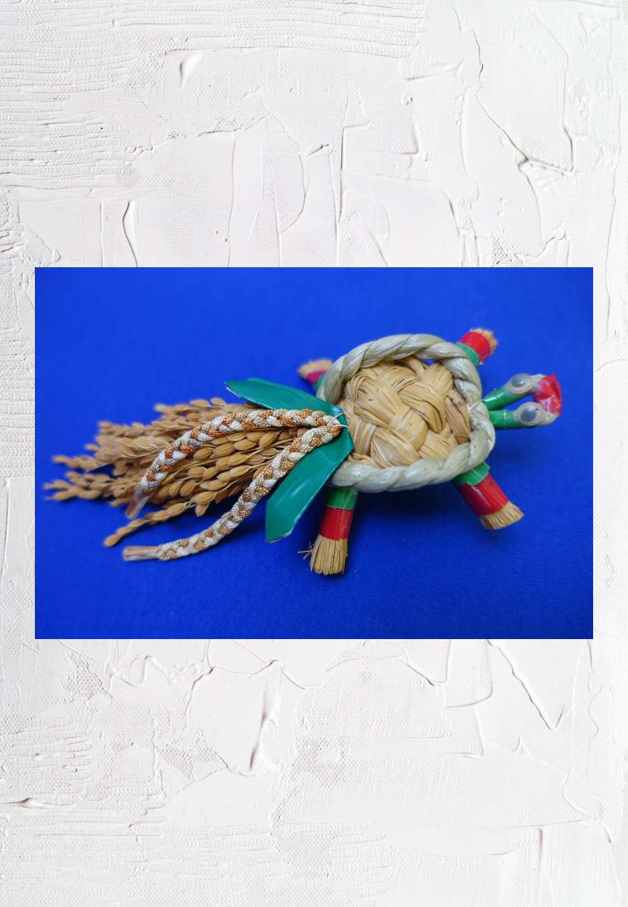Glücksbringer zum aufhängen, z.B. in der eigenen Wohnung oder auch im Auto, zeitgenössische Flechtarbeit aus Reisstroh, Größe 17,5 cm, Motiv Minogame (mit Schleierschwanz aus Reiskörnern). Die Gestaltung aus Stroh ist in Japan verbreitet, inzwischen gibt es aber nur noch wenige Kunsthandwerker, die sich dem Flechten widmen. Ich habe das Objekt aus Fukuoka über die Schwester von Keiko Tanaka (Micheko-Galerie, München) als Geschenk erhalten.