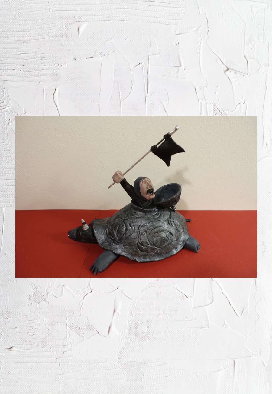 Unikat, handgetöpfert, gebrannt und mit Acrylfarben bemalt, Titel "Schwerer Panzerreiter", sign. 2023, Größe 23 cm. Die Skulptur bezieht sich klar