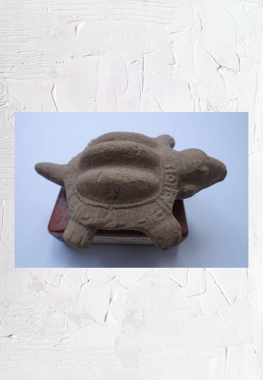 Objekt aus Ton, naturbelassen, aus der Blütezeit der Maya um ca. 700 nach Chr., Größe 11,5 cm, auf kleinem Holzsockel, Zuschlag Auktion Gorny & Mosch, Provenienz ex Süddeutsche Sammlung U.H., mit Thermolumineszenz-Gutachten (Ralf Kotalla, Labor für Fälschungserkennung). Die Schrift der Maya ist trotz Fortschritten bis heute nicht vollständig entschlüsselt. Es gibt u.a. Zeichen, die sich als Schildkröte interpretieren lassen.