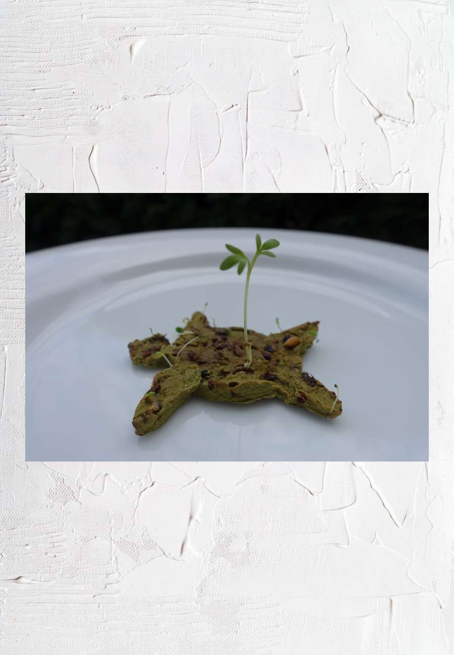 Selbstgeschöpftes Papier (Eierkarton, im Mixer püriert), Wildblumensaat eingebettet, mit Förmchen ausgestochen und getrocknet, Größe 5,5 cm. Nach Erhalt gewässert, damit die Saat aufgeht. Auf diese Art wurden 3 Exemplare produziert.