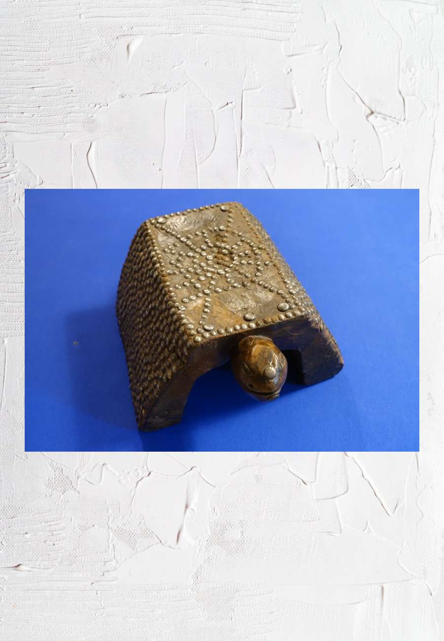 Hocker, Kunsthandwerk des Volks der Ngombe, Tropenholz (um 1950, schöne Patina), mit ca. 1.000 Polsterziernägeln besetzt, Größe 29 x 26 cm. Diese Sitze bezeugten den Status der Eigentümer. Interessant ist zudem ein Vergleich mit gepunkteten Ziernarben (Skarifizierung, eine tief verankerte Tradition unterschiedlicher Völker) auf der Haut dieser Ethnie, aber auch bei den Luba (ebenfalls weitgehend aus dem Kongo), dort kommen Punktmuster teilweise am ganzen Körper vor.