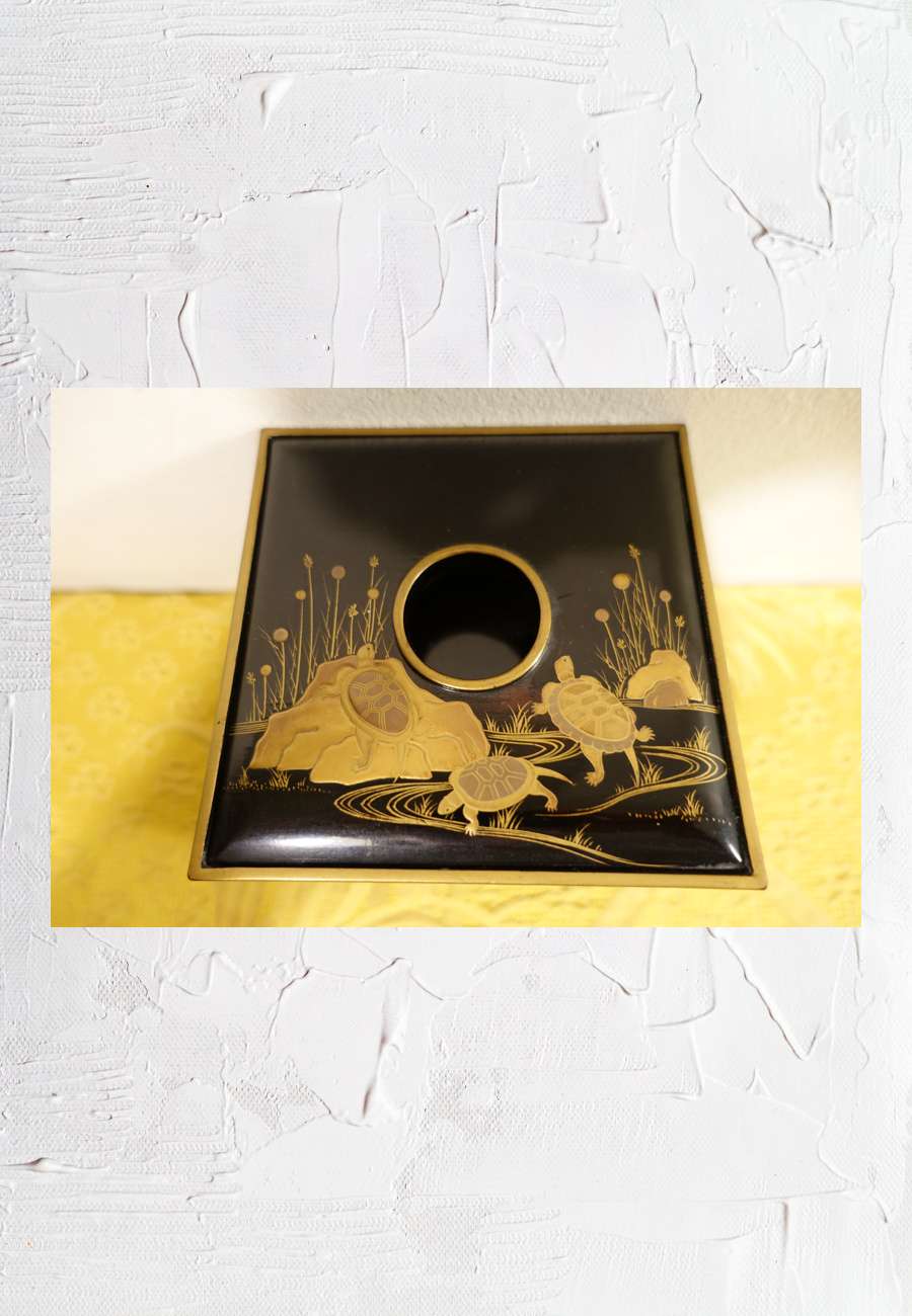Gefäß aus Japan, Gold-Lack-Malerei (Meiji-Zeit), in einen Unterbau mit vier Pfeilern ist ein Fach eingelassen, im Deckel eine Landschaft mit Schildkröten, Größe 13,2 x 13,2 cm, Höhe 10,2 cm,