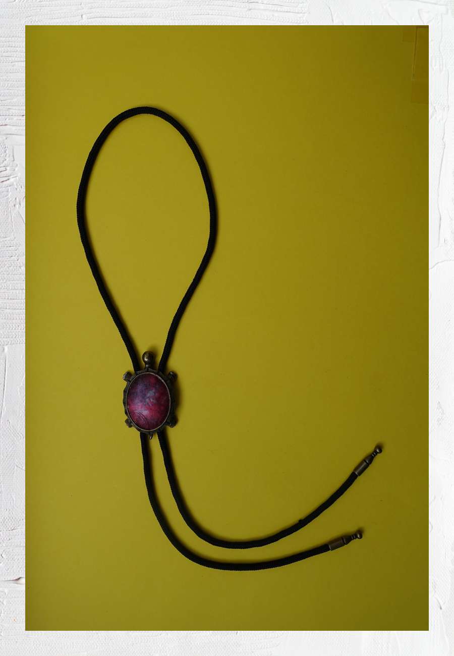 Dieses Stück wird als "Bola" bezeichnet, man trägt es ähnlich wie eine Krawatte, hergestellt in einer koreanischen Manufaktur. Die Schildkröte ist aus Messing (6,5 cm), mit einem Panzer aus rot gefärbtem Papier, die Kordel aus Textilfasern gedreht, Gesamtlänge ca. 50 cm.