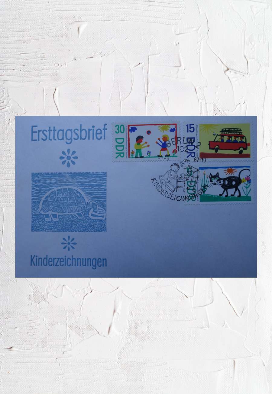 Ersttagsbrief der Deutschen Demokratischen Republik mit Kinderzeichnungen, verziert mit einer aufgedruckten Schildkröte.