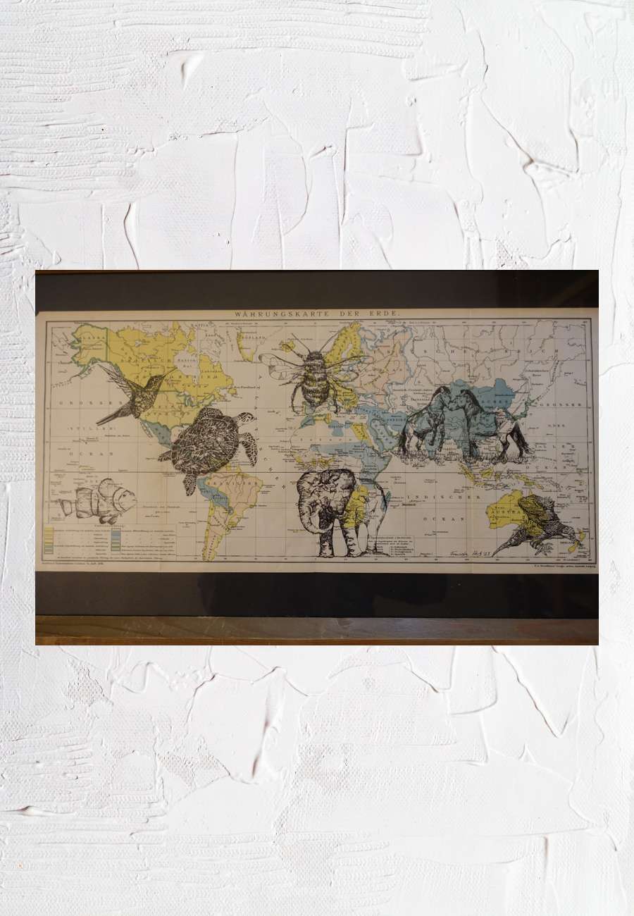 Währungskarte der Erde, Verlag F.A. Brockhaus, Leipzig, von ca. 1886. Leitgedanke ist der weltweit dringende Artenschutz (s. auch weitere Objekte der Künstlerin).