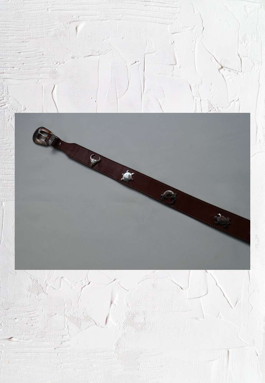 Gürtel, eingenietet sind Tiere aus Metall, u.a. ein Bison und zwei Schildkröten, mit indianischem Design (Silver Creek Collection), made in USA, Länge 89 cm.