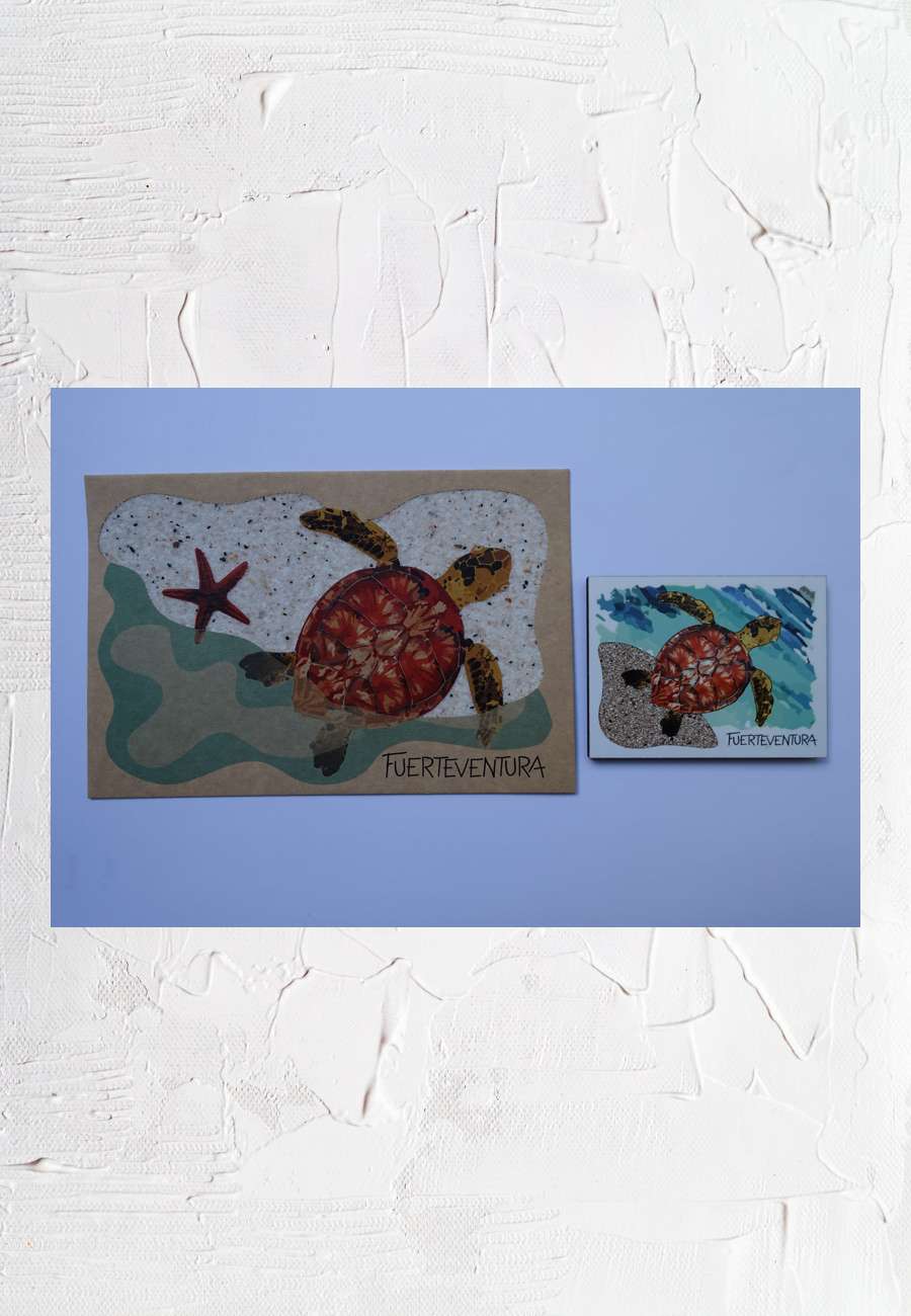 Karte, Collage aus Papier und echtem Sand der Insel, sogar patentiert, made in Canary Islands (smartgiftdesign.com). Ein sehr ähnliches Motiv (Caretta Caretta am Strand von "El Cofete"), ebenfalls mit Sand, gibt es auch als Magnet (rechts), Format 7 x 5,5 cm.