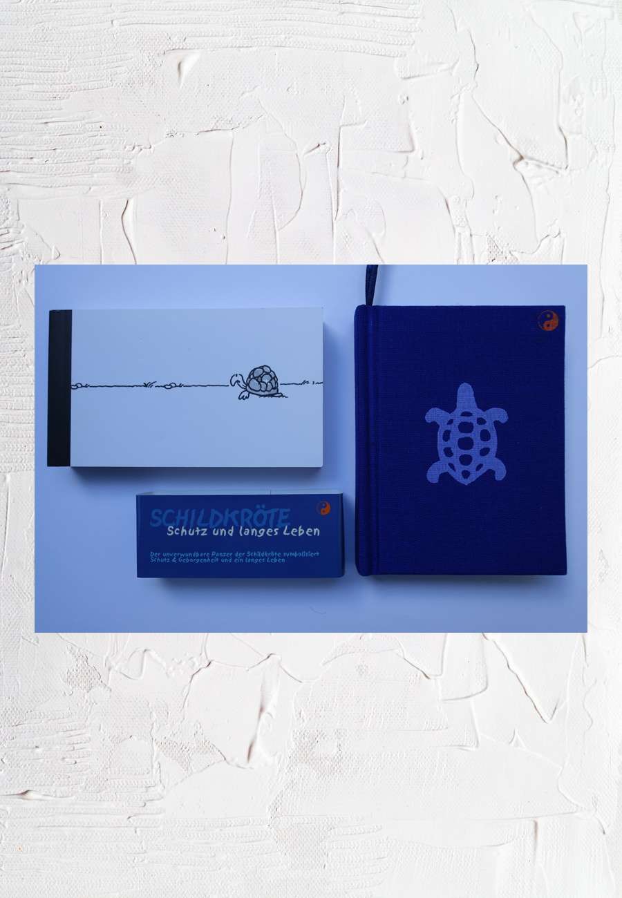 Schildkröte (österreichischer Karikaturist, s. unter Suche: "Haderer"). Rechts daneben: kleines Notizbuch, in Leinen gebunden und mit einer schmalen Papiermanschette versehen, Text s. unten (evtl. vergrößern durch anklicken des Bildes), Design von A. Rieck, Verlag Räder, Bochum.